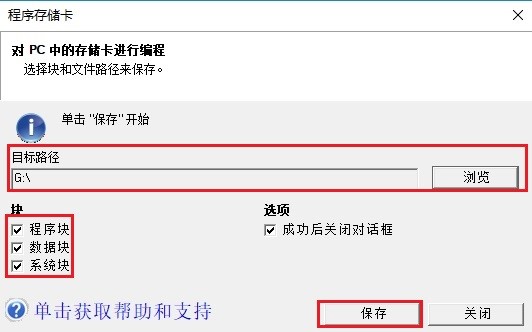 打開"程序存儲卡"對話框,選擇需要被拷貝到存儲卡上的塊(程序塊、系統塊、數據塊),單擊"瀏覽"按鈕,導航至SD卡的根文件夾,如圖5所示: